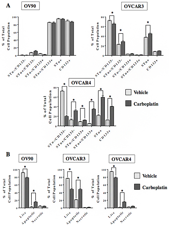 Figure 3: STn+ and CD133+ cells display chemoresistance. (A) OV90, OVCAR3 and OVCAR4 cells were cultured for 72 hours in the presence of either vehicle control or carboplatin (10 μM). Following treatment, adherent cells were trypsinized and analyzed by flow cytometry to determine the relative frequency of STn-/CD133-, STn+/CD133-, STn-/CD133+ and STn+/CD133+ sub-populations. (B) In a parallel analysis, the total number of live, apoptotic and necrotic cells remaining after 72 hours of exposure to vehicle control or carboplatin (10 μM) was determined by annexin assay. Error bars represent the mean ± SEM. *p < 0.05. All experiments were repeated a minimum of three times.