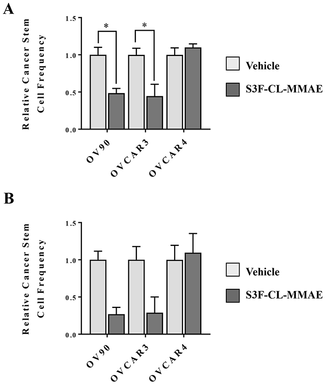OV90, OVCAR3 and OVCAR4 cells were plated in triplicate (3.5x105 cells/well) in 6 well plates and treated after 24 hours with either 10 nM S3F-CL-MMAE or the vehicle control. After 3 or 6 days, cells were harvested, re-suspended in in serum-free DMEM/F-12, HEPES medium with 1X B-27 supplement (Gibco), 10 ng/mL human epidermal growth factor (Life Technologies) and 20 ng/mL human β fibroblast growth factor (Life Technologies) and plated in low adhesion 96 well plates at concentrations of 1, 10, 20 and 40 cells/well. After 7-8 days in culture, the wells were evaluated for presence or absence of tumorspheres. Tumor cell aggregates were not counted as positive unless individual tumorspheres were identified. Stem cell frequencies were then calculated as described (http://bioinf.wehi.edu.au/software/elda/).