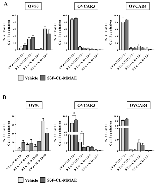Figure 6: Treatment with the anti-STn, S3F-CL-MMAE, on CD133 and STn populations in vitro. OV90, OVCAR3 and OVCAR4 cell lines were harvested 72 (A) or 144 (B) hours post treatment with vehicle or S3F-CL-MMAE (10 nM), and the relative frequency of STn-/CD133-, STn+/CD133-, STn-/CD133+ and STn+/CD133+ fractions was determined by flow cytometry. Error bars represent the mean and SEM. *p < 0.05. All experiments were repeated four times.