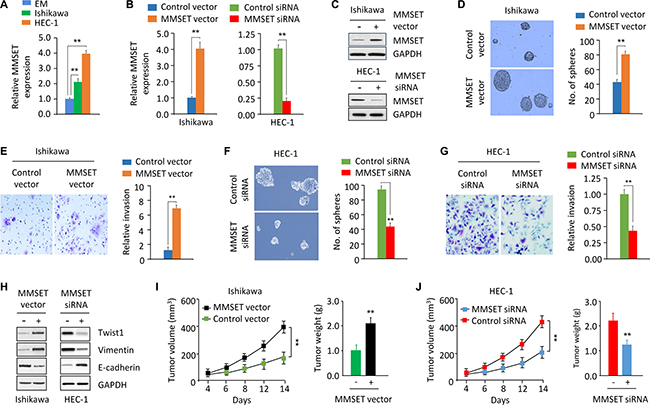 Figure 1: MMSET upregulation promotes sphere formation and invasion in EC cells. (A) qPCR analysis of MMSET mRNA expression in the immortalized human endometrial epithelial EM cell line and EC cell lines. (B and C) qPCR analysis and western blotting analysis of MMSET expression in Ishikawa cells after transient overexpression of MMSET, and in HEC-1 cells after transient knockdown of MMSET. (D and E) Sphere formation (D) and invasion (E) in Ishikawa cells after transient overexpression of MMSET. (F and G) Sphere formation (F) and invasion (G) in HEC-1 cells after transient knockdown of MMSET. (H) Western blotting analysis of indicated proteins in Ishikawa and HEC-1 cells after overexpression or knockdown of MMSET. (I) Ishikawa cells were transfected with MMSET expression vector or the control vector in culture plates. 48 hours later, MMSET-overexpressing Ishikawa cells were injected into nude mice. Tumor volume and weight were measured. (J) HEC-1 cells were transfected with MMSET siRNA or the control siRNA in culture plates. 48 hours later, MMSET-knockdown HEC-1 cells were injected into nude mice. Tumor volume and weight were shown. **P < 0.01.