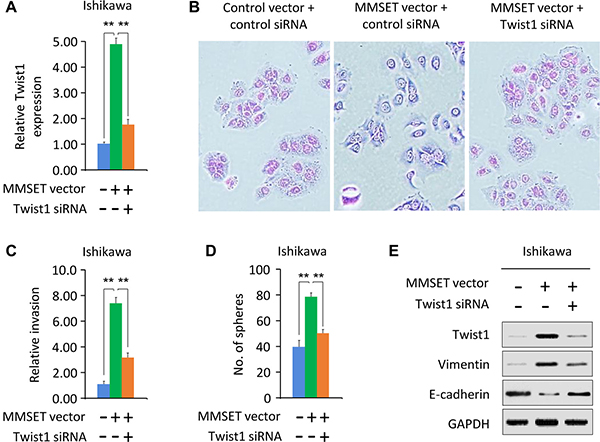 Figure 2: Twist1 mediates MMSET-induced sphere formation and invasion. (A) Ishikawa cells were transfected with control vector or MMSET-expressing vector, together with siRNA targeting MMSET or control siRNA. Relative Twist1 expression was analyzed using qPCR. (B) Morphological appearance of cells described in (A) was analyzed by microscopy. (C and D) Invasion (C) and sphere formation (D) of cells described in (A) was determined using transwell invasion and sphere formation assay. (E) Western blotting analysis of indicated proteins in cells described in (A). **P < 0.01.