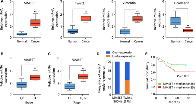 Figure 3: Elevated MMSET expression predicts poor survival in EC. (A) Relative mRNA expression of MMSET, Twist1, Vimentin and E-cadherin in 50 matched human normal endometrial tissues and EC tissues. (B and C) Relative MMSET mRNA levels in EC samples were categorized based on tumor grade (B) and stage (C). (D) Meta-analysis of MMSET and Twist1 mRNA in EC samples and adjacent normal tissues from the BioExpress database. (E) Kaplan–Meier overall survival curves for high and low MMSET mRNA expression in EC patients. **P < 0.01.