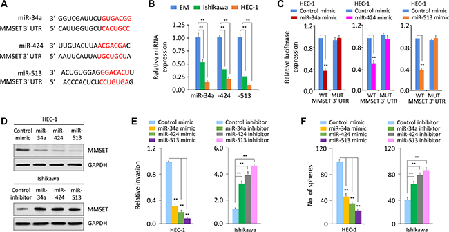 Figure 4: miR-34a, miR-424 and miR-513 directly target MMSET 3′-UTR to downregulate MMSET expression in EC cells. (A) Alignment of miR-34a, miR-424 and miR-513 and their corresponding complementary binding sequences in MMSET 3′-UTR by bioinformatics algorithms. (B) Relative miR-34a/miR-424/miR-513 levels in EC cell lines and EM cells. (C) HEC-1 cells were transfected with reporter constructs containing either wild-type (WT) MMSET, or MMSET 3′-UTR with mutation (MUT), along with miR-34a/miR-424/miR-513 mimic or negative control mimic, respectively. Relative luciferase activity was measured. (D) Western blotting analysis of MMSET expression in EC cells after overexpression or knockdown of miR-34a/miR-424/miR-513. (E and F) Cell invasion (E) and sphere formation (F) of EC cells after overexpression or knockdown of miR-34a/miR-424/miR-513. **P < 0.01.