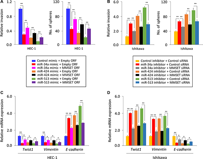 Figure 5: miR-34a, miR-424 and miR-513 inhibit EMT, invasion and the sphere-forming ability of EC cells through targeting MMSET. (A) miR-34a/miR-424/miR-513 mimic or control mimic was co-transfected into HEC-1 cells, together with (or without) MMSET cDNA vector lacking the 3′-UTR region. (B) miR-34a/miR-424/miR-513 inhibitor or control inhibitor was co-transfected into Ishikawa cells, together with (or without) MMSET siRNA. Cell invasion and sphere formation assays were performed. (C and D) qPCR analysis of indicated genes in HEC-1 (C) and Ishikawa (D) cells treated as described above. *P < 0.05, **P < 0.01.
