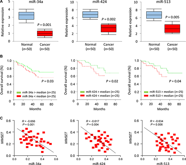 To address the relevance of miR-34a/miR-424/miR-513 expression to human EC, we examined the levels of these miRNAs in primary ECs using qPCR analysis. Significant reduction in miR-34a/miR-424/miR-513 levels were apparent in EC samples compared to adjacent normal endometrial tissues (Figure 6A). To determine if reduced miR-34a/miR-424/miR-513 expression is associated with any change in survival probability, we compared Kaplan-Meier plots for high and low expression of miR-34a/miR-424/miR-513. For a set of 50 patients with EC, reduced expression of miR-34a/miR-424/miR-513 was significantly associated with a poorer prognosis of EC patients (Figure 6B), To explore whether the miR-34a/miR-424/miR-513-MMSET axis is clinically relevant, we assessed the correlation between the expression of miR-34a/miR-424/miR-513 and MMSET in EC tissues using qPCRs. We detected a significant negative association between miR-34a/miR-424/miR-513 and MMSET mRNA expression (Figure 6C). Taken together, these results supported an existence of the miR-34a/miR-424/miR-513-MMSET axis in human EC.