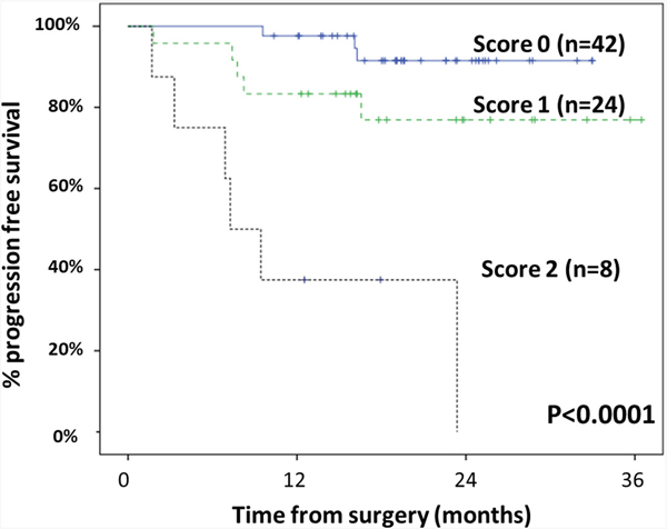 Figure 2: Progression-free survival (PFS) of sCRC patients stratified by the prognostic score proposed in the present study. This prognostic score was established based on the most informative variables predicting for the PFS (TNM stage at diagnosis and the mutational status for the BRAF gene), as follows: score 0, TNM stage 0-II; score 1, TNM stage III patients with wild-type BRAF; score 2, TNM stage III cases with BRAF mutations plus TNM stage IV cases.
