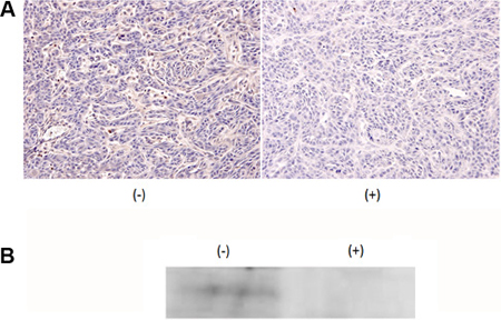 Figure 3: Addition of 1 mM NiCl2 in drinking water inhibited MMP9 expression. HSC3 cells were xenografted to the tongue of nude mice. After tumor mass formation, mice were fed with regular drinking water (n = 5) or 1 mM NiCl2-containing water (n = 7) for 1 week. (A) The tissue was excised, formalin-fixed and embedded in paraffin. The expression of MMP9 was examined by immunohistochemical staining using anti-MMP9 Ab as the first Ab. (B) The excised tissue were minced, lysed with cell lysis buffer and subjected to IP-Western. Representatives of three independent experiments were shown for both (A and B).