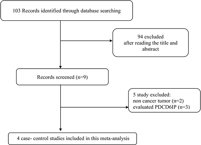A comprehensive search in PubMed, Web of Science, Scopus, and Google Scholar databases was performed for all articles describing an association between PDCD6 polymorphism and cancer risk published up to November 2017 without language restriction. The search strategy was “cancer, carcinoma, tumor, neoplasm”, “PDCD6, programmed cell death 6”, and “polymorphism, mutation, variant”. Figure 2 summarized the process of identifying eligible studies. Relevant studies, eligible for the meta-analysis must meet the following criteria: 1) Original case-control studies of the correlation between the PDCD6 polymorphism and cancer; 2) studies provided sufficient information of the genotype frequencies of PDCD6 polymorphism in both cases and controls; 3) the studies have not repeated reports in the same population. The criteria for exclusion were: 1) the articles that describe case reports, reviews, overlapped data, animal or mechanism studies for PDCD6 polymorphism and cancer; 2) no genotype frequency or genotype information were provided for PDCD6 polymorphism and cancer; 3) insufficient information for data extraction.
