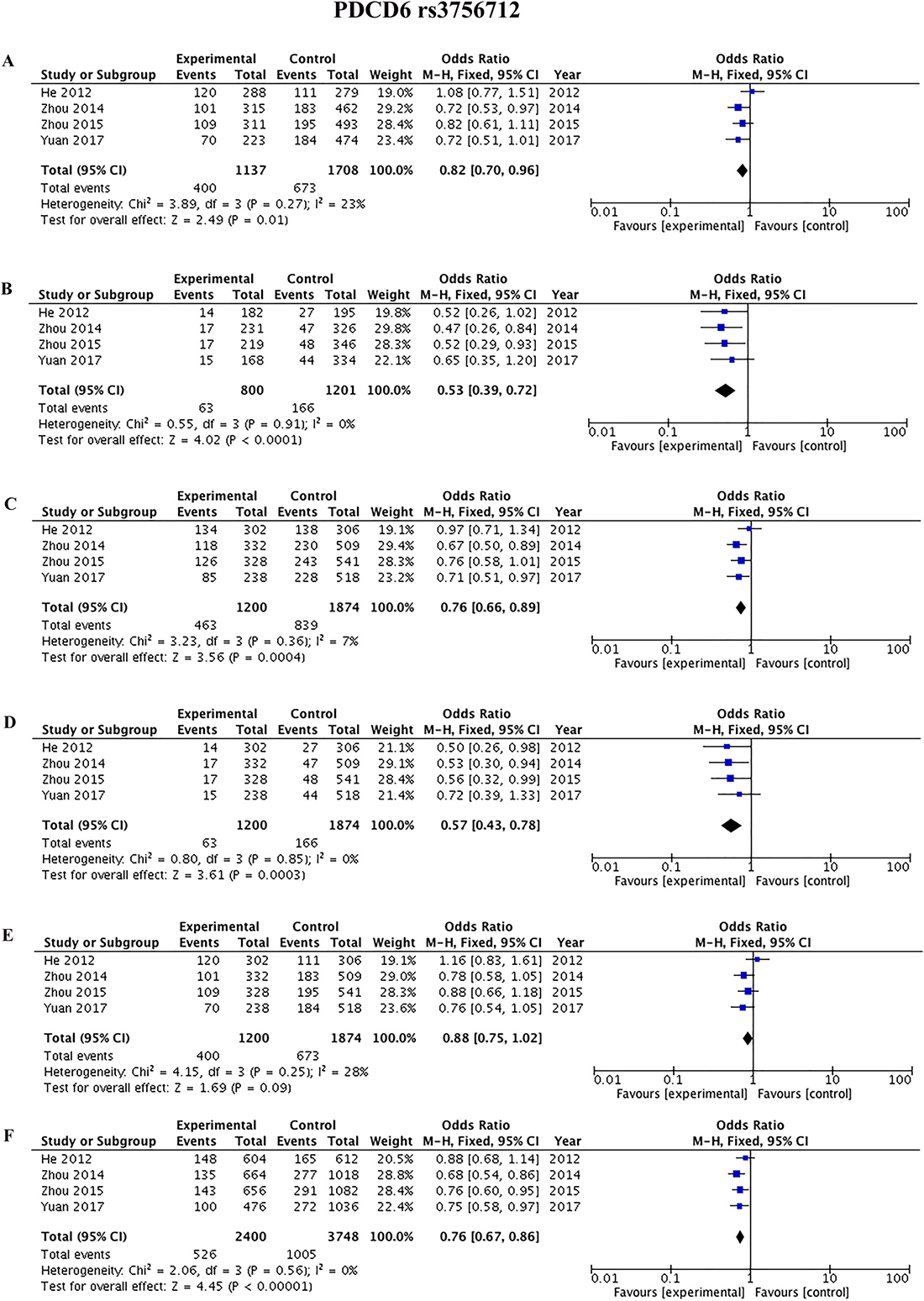Figure 7: Sensitivity analyses for studies on PDCD6 rs3756712 T>G using different genetic models. (A) TG vs TT, (B) GG vs TT, (C) TG+GG vs TT, (D) GG vs TT+TG, (E) TG vs TT+GG, and (F) G vs T.