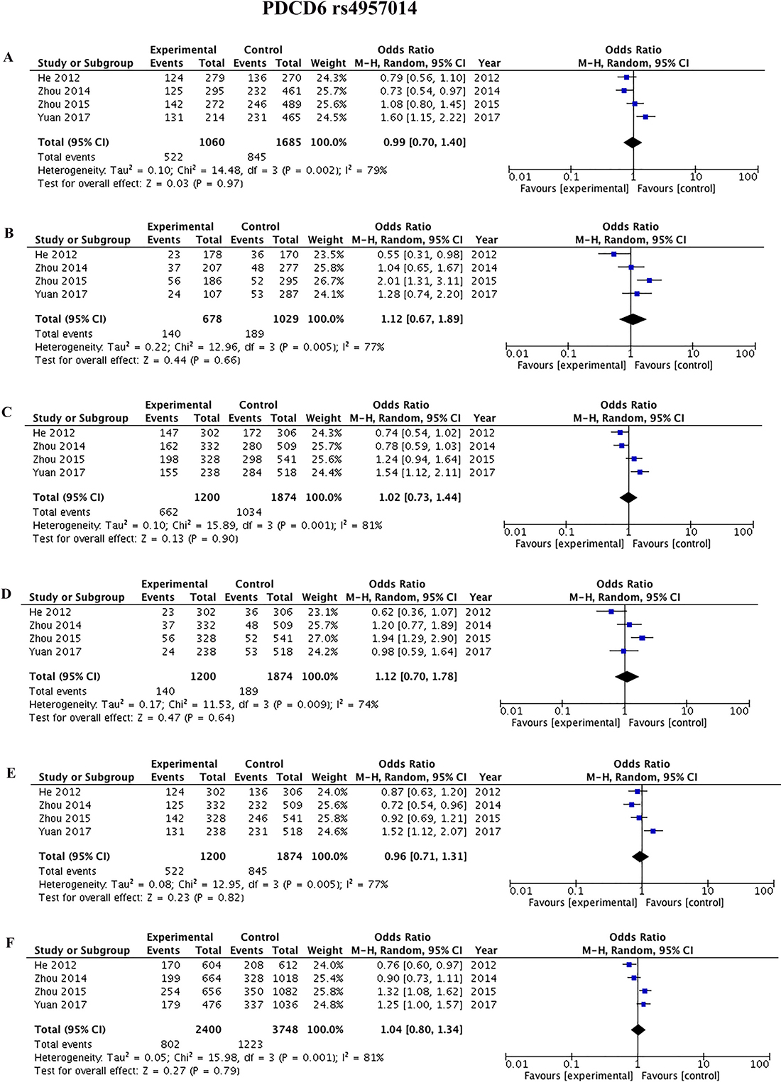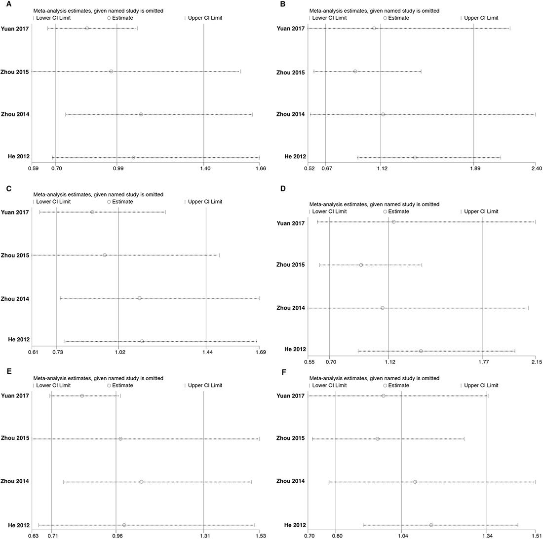 Figure 8: Sensitivity analyses for studies on PDCD6 rs4957014 T>G using different genetic models. (A) TG vs TT, (B) GG vs TT, (C) TG+GG vs TT, (D) GG vs TT+TG, (E) TG vs TT+GG, and (F) G vs T.