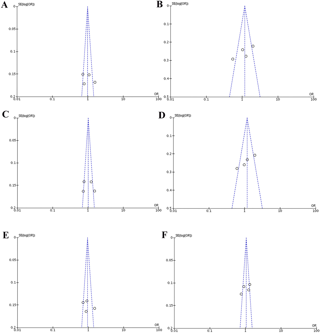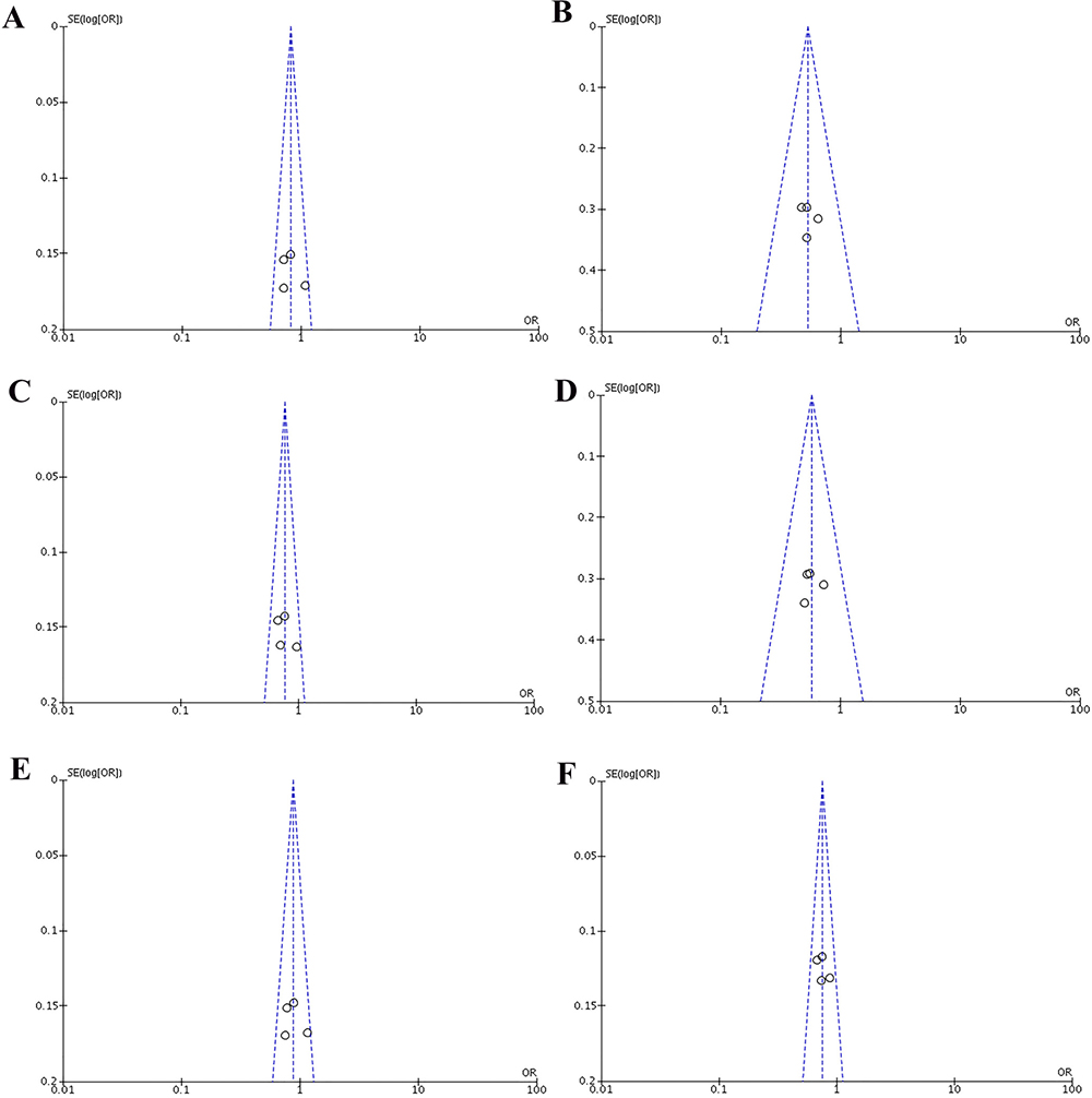 Figure 5: Funnel plots of the association between cancer risk and the rs3756712 T>G polymorphism in the overall study population under the following models. (A) TG vs TT, (B) GG vs TT, (C) TG+GG vs TT, (D) GG vs TT+TG, (E) TG vs TT+GG, and (F) G vs T.