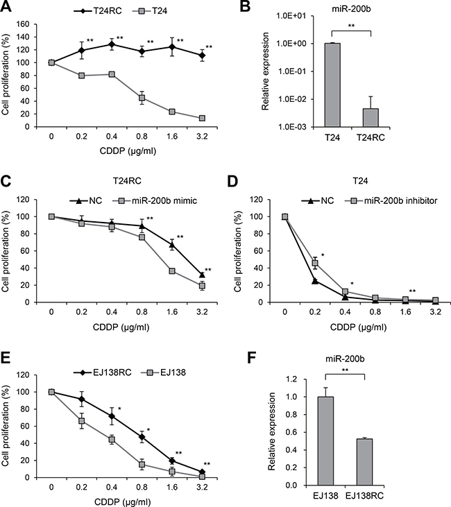 Figure 1: Downregulation of miR-200b in CDDP-resistant BCa cells. (A) Anti-tumor effects of CDDP in T24 and T24RC cells. Numbers of cells treated with the indicated concentrations of CDDP are shown relative to those without treatment. (B) qRT-PCR analysis of miR-200b in T24 and T24RC cells. (C) Effects of miR-200b on CDDP sensitivity in T24RC cells. Numbers of cells transfected with a miR-200b mimic or negative control (NC) and then treated with the indicated concentrations of CDDP are shown relative to cells without treatment. (D) Effects of miR-200b inhibition on CDDP sensitivity in T24 cells. Cells were transfected with a miR-200b inhibitor or negative control (NC) and then treated with the indicated concentrations of CDDP. (E) Anti-tumor effects of the indicated concentrations of CDDP on EJ138 and EJ138RC cells. (F) qRT-PCR analysis of miR-200b in EJ138 and EJ138RC cells. Shown are means of 6 (A, C–E) or 3 (B, F) replications; error bars represent SDs. *P < 0.05, **P < 0.01.