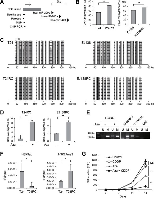 Figure 2: Epigenetic silencing of miR-200b in CDDP-resistant BCa cells. (A) Schematic representation of the miR-200b, -200a and -429 genomic loci. Location of the CpG island and regions analyzed using the indicated methods are also shown. (B) Results of bisulfite pyrosequencing in the indicated BCa cells. (C) Results of bisulfite sequencing in the indicated cells. The region analyzed with bisulfite pyrosequencing is indicated by an arrow. (D) qRT-PCR analysis of miR-200b in CDDP-resistant BCa cells treated with or without 5-aza-dC (Aza). (E) MSP analysis in T24RC cells treated with or without 5-aza-dC. Bands in the ‘‘M’’ lanes are PCR products obtained with methylation-specific primers; those in the ‘‘U’’ lanes are products obtained with unmethylated-specific primers. In vitro methylated DNA and DNMT1/DNMT3B double knockout HCT116 cells serve as methylated and unmethylated controls. (F) ChIP-PCR analysis in the indicated cells. Levels of H3K9ac and H3K27me3 are shown. (G) Proliferation of T24RC cells treated with or without 5-aza-dC (Aza) and/or CDDP. Numbers of cells with the indicated treatments are shown relative to the numbers on day 0 (5 × 103 cells). Shown in B, D, F and G are means of 3 replications; error bars represent SDs. NS, not significant; *P < 0.05, **P < 0.01.