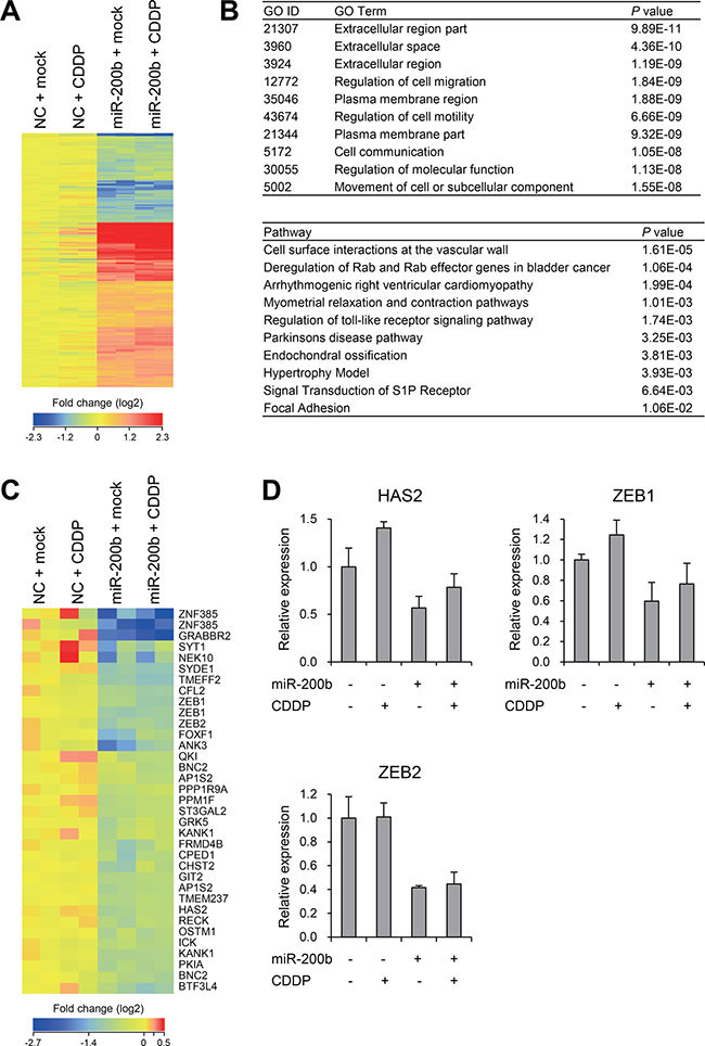 Figure 3: Effects of miR-200b on gene expression profiles in CDDP-resistant BCa cells. (A) Heat map showing expression of 733 probe sets (595 genes) identified through microarray analysis of T24RC cells transfected with a miR-200b mimic or negative control (NC) and then treated with or without CDDP. (B) Results of gene ontology (GO, upper) and pathway (lower) analyses of the 595 selected genes. (C) Heat map showing expression of miR-200b target genes predicted by TargetScan. (D) qRT-PCR analysis of the indicated genes in T24RC cells with or without miR-200b and/or CDDP. Shown are means of 3 replications; error bars represent SDs.