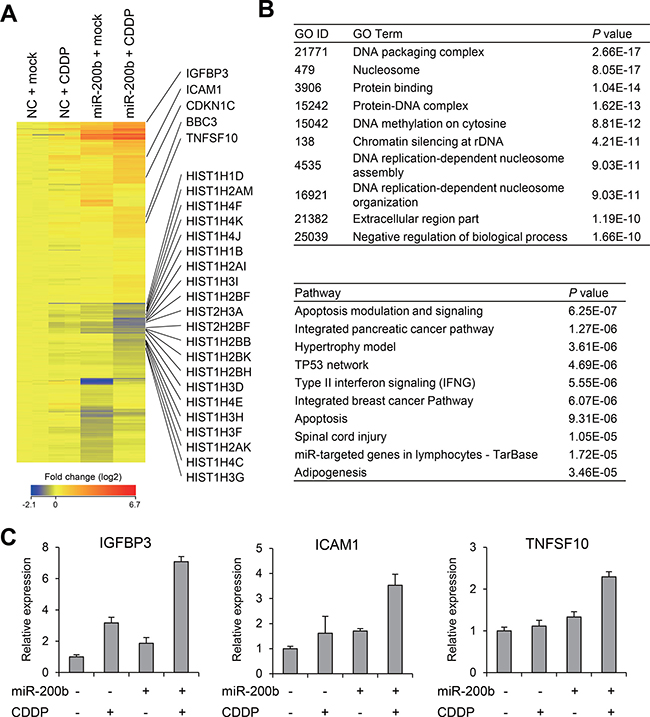 We next assessed the effects of CDDP/miR-200b and found that, by itself, CDDP had only limited effects on gene expression, whereas miR-200b induced significant changes in the gene expression profile of T24RC cells (Supplementary Figure 3). We then selected genes that were differentially expressed between T24RC cells treated with miR-200b alone and those treated with miR-200b + CDDP (P < 0.05), and identified a series of 551 probe sets corresponding to 509 unique genes (Figure 4A, Supplementary Table 3). Gene ontology analysis revealed that genes associated with “DNA packaging complex” and “nucleosome” were enriched among 509 selected genes (Figure 4B). Consistent with this result, a number of genes encoding histones were downregulated by miR-200b + CDDP, perhaps reflecting inhibition of DNA replication and the cell cycle (Figure 4A). Pathway analysis suggested that genes associated with “apoptosis modulation and signaling” were also enriched among the selected genes (Figure 4B). Consistent with this finding, apoptosis-related genes, including TNFSF10 (also known as tumor necrosis factor-related apoptosis-inducing ligand, TRAIL) and BBC3 (also known as PUMA), were upregulated by miR-200b + CDDP (Figure 4A). We also found that IGFBP3 and ICAM1, which are reportedly associated with CDDP resistance, were synergistically upregulated by miR-200b + CDDP [18–20] (Figure 4A). These microarray results were validated for selected genes using qRT-PCR (Figure 4C). Collectively then, these results suggest miR-200b sensitizes BCa cells to CDDP by inducing multiple genes involved in determining chemosensitivity and cytotoxicity.