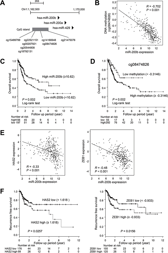 Figure 5: Analysis of the expression and DNA methylation of miR-200b in clinical BCa tumors using TCGA data sets. (A) Locations of Infinium BeadChip probes in the CpG island of miR-200b. Genomic locations are based on Human GRCh38/hg38. (B) Correlation between levels of miR-200b expression and DNA methylation of the indicated probe in primary BCa (n = 345). The Pearson’s correlation coefficient (R) is also shown. (C) Kaplan–Meier curve showing the effect of miR-200b expression on overall survival of BCa patients (n = 353). (D) Kaplan–Meier curve showing the effect of DNA methylation of the indicated probe on overall survival of BCa patients (n = 347). (E) Correlation between levels of miR-200b expression and expression of HAS2 (left) or ZEB1 (right) in primary BCa (n = 345). (F) Kaplan–Meier curves showing the effects of HAS2 (left) and ZEB1 (right) expression on recurrence-free survival among patients with stage 2 or higher BCa (n = 275).