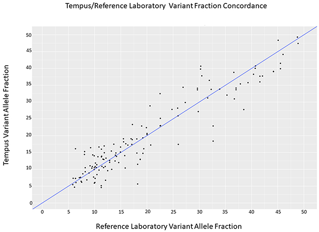 The Neogenomics assay is known to be of high sensitivity and specificity for clinically relevant targeted genes, and it was thus used as a comparator for the Tempus xO sensitivity study. Samples without associated metadata were sent to Neogenomics while being sequenced in parallel at Tempus in order to ensure a properly blinded study. Subsequent to sample send out, the Tempus xO assay was run on each of the 19 samples and variants were identified using Tempus Labs’ computational pipeline and algorithms. Neogenomics returned reports detecting 42 variants present within the 19 samples, 41 of which were detected by the Tempus xO assay. The discordant variant was a TP53 p.Gly112Asp at 5% variant allele fraction that was not reported by the Tempus xO assay because it is known to be benign and was therefore filtered by variant analysis.