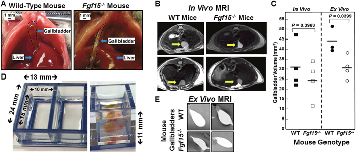 Figure 1: Altered gallbladder shape and diminished gallbladder filling in FGF15-deficient mice. (A) Photographs of WT and FGF15-deficient mouse gallbladders in situ at laparotomy. To improve visual clarity, dashed lines demarcate gallbladders. FGF15-deficient mouse gallbladders were tubular in appearance compared to the spherical gallbladders observed in WT mice. Size bars, 1 mm. (B) Representative images from in vivo MRI of WT and FGF15-deficient mice show differences in gallbladder shape. Arrows demarcate gallbladders. (C) In vivo (left) and ex vivo (right) measurements of volume of gallbladders from WT and FGF15-deficient mice. Each symbol represents one mouse gallbladder. Horizontal lines demarcate mean values. Mean ex vivo volumes were significantly greater in gallbladders from WT compared to FGF15-deficient mice; P=0.0399). (D) Septate Lucite box used for ex vivo imaging of murine gallbladders. Measurements indicate internal and external dimensions of tray containing 2% agarose. Right panel show vertical dimension and gallbladder surrounded by 2% agarose in chamber. (E) Representative images from ex vivo MRI of gallbladders from WT and FGF15-deficient mouse highlight differences in gallbladder shape.