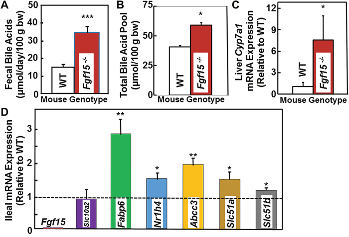 Figure 2: Increased fecal bile acids, total bile acid pool, and expression of hepatic Cyp7a1 and genes related to bile acid transport in FGF15-deficient mice. (A) Bar graph shows 2.26-fold increase in fecal bile acids levels in FGF15-deficient compared to WT mice (P <0.001). Mean ± SE for five FGF15-deficient and five WT male mice maintained in metabolic cages throughout the three-day stool collection. bw, body weight. (B) Bar graph shows 45% increase in the total bile acid pool in FGF15-deficient compared to WT mice (P <0.05). (C) Bar graph shows changes in hepatic mRNA expression of Cyp7a1, an FGF15 target gene. We determined mRNA expression by Q-PCR analysis (in triplicate), normalized using Gapdh. We expressed data as mean ± SE Cyp7a1 mRNA expression in livers from five FGF15-deficient male mice relative to that measured in livers from three WT male mice (set at 1). (D) Bar graph shows changes in ileal mRNA expression of genes related to bile acid metabolism [Nrih4 encodes the farnesoid X receptor (FXR)] and transport [Slc10a2 encodes ASBT, Fabp6 encodes intestinal bile acid binding protein (IBABP), Abcc3 encodes multidrug resistance associated protein-3 (MRP3), and Slc51a and Slc51b encode organic solute transporters (Ostα and Ostβ), respectively]. We determined mRNA expression by Q-PCR analysis (in triplicate), normalized using Gapdh. We expressed data as mean ± SE ileal mRNA expression for six FGF15-deficient male mice relative to that measured in six WT male mice (set at 1). *P <0.05; **P <0.01; ***P < 0.001.