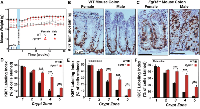 Figure 3: Experimental design and effects of FGF15 deficiency on colon epithelial cell proliferation in AOM/DSS-treated mice. (A) Experimental design and mouse weights over the course of the 20-week study. We weighed mice weekly. Vertical arrows on the horizontal axis indicate intraperitoneal injection with 7.5 mg/kg AOM/kg body weight at day 1, 8, 15, and 22. Vertical blue band indicates that we added 2.5% dextran sulfate sodium (DSS) to the drinking water of AOM-treated mice on days 29 through 33. Fourteen WT and 15 Fgf15-/- mice were treated with AOM plus DSS. Error bars denote SE. There were no differences between the weights of WT and FGF15-deficient mice. However, regardless of genotype, male mice weighed 10-20% more than female mice. (B and C) Representative images of Ki67 immunostaining in crypts from female and male WT (B) and Fgf15-/- (C) mouse colons. Note increased Ki67 immunostaining in upper portions of crypts from FGF15-deficient mice. (D-F) FGF15 deficiency is associated with increased colon epithelial cell proliferation. An investigator masked to genotype measured the Ki67 labeling index in normal crypts from the distal half of each mouse colon. Crypts were divided into five equal zones, starting from the proliferative area at the base (zone 1) and extending to the luminal surface (zone 5), and immunostaining was assessed in approximately 1000 colon epithelial cells from each mouse. (D) Results for 14 WT and 15 Fgf15-/- mice; (E) Results for 6 WT and 7 Fgf15-/- female mice; (F) Results for 8 WT and 8 Fgf15-/- male mice. We observed significant increases in Ki67 staining in the upper portions of crypts in non-neoplastic segments of colon from FGF15-deficient compared to WT mice overall and in female and male mice evaluated separately. (***P < 0.001).