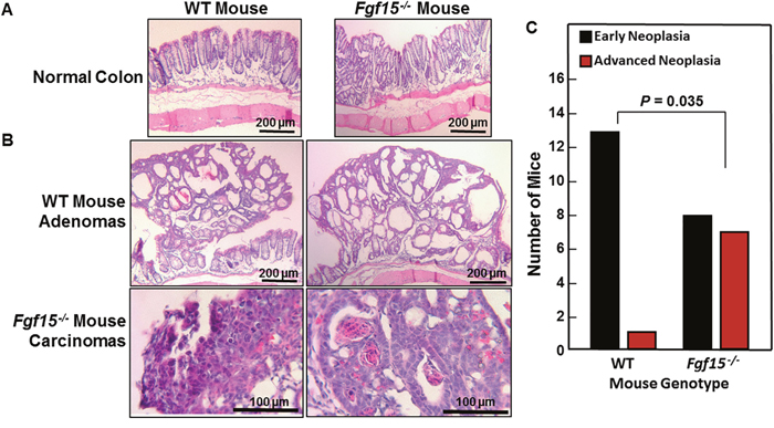 Figure 5: Advanced colon neoplasia in FGF15-deficient mice. (A) Representative images of normal colons from WT and FGF15-deficient mice. Size bars, 200 μm. (B) Representative images of colon adenomas in two WT mice and adenocarcinomas in two FGF15-deficient mice. Size bars, 200 and 100 μm, respectively. (C) Numbers of WT and FGF15-deficient mice whose colons contained only early neoplasia [aberrant crypt foci (ACF) and/or adenomas] versus those containing advanced neoplasia (high-grade dysplasia and/or adenocarcinoma). The distribution of these lesions in WT versus FGF15-deficient mice was significantly different (P = 0.035, two-tailed Fisher’s exact test).