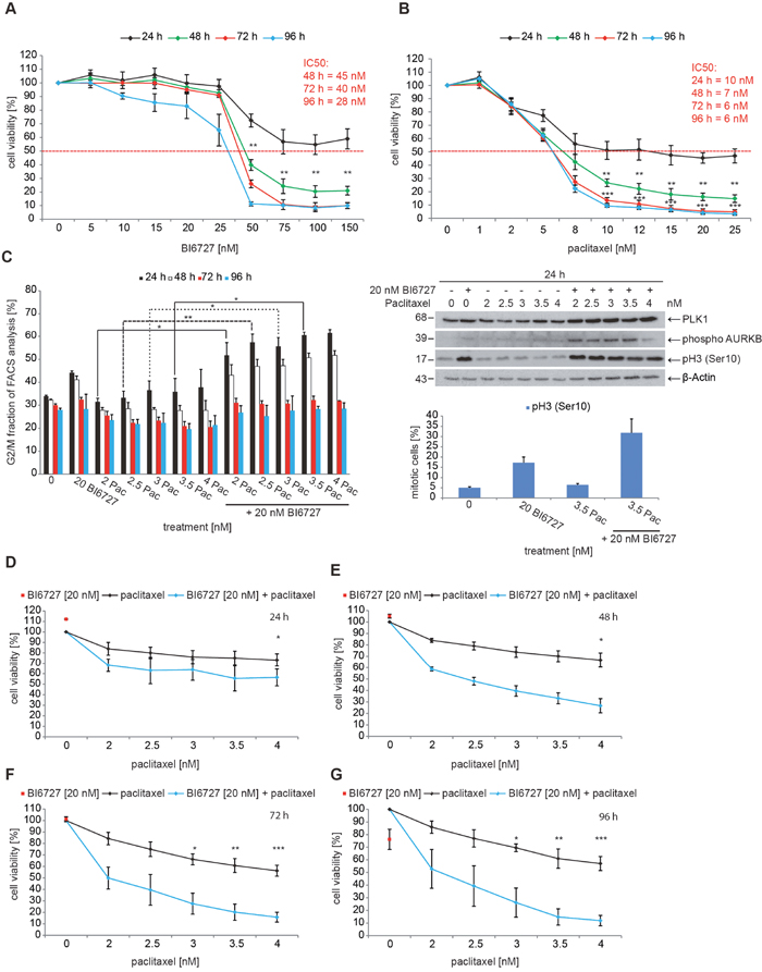 Figure 1: BI6727 treatment sensitizes ovarian cancer cells to paclitaxel. (A) OVCAR-3 cells were treated with increasing concentrations of BI6727 or (B) of paclitaxel (Pac). Cell viability was measured over 4 d using the Cell Titer-Blue® Cell Viability Assay. (C) (Left panel) The G2/M fraction was determined over 4 d post-treatment using flow cytometry. Measurements were statistically significant by two-tailed Student’s t-test (*P ≤ 0.05; **P ≤ 0.01). Each bar graph represents the mean value ± SEM (n=3). (Upper right panel) Endogenous levels of PLK1, Cyclin B1, phospho-Histone H3 and phospho-Aurora B were determined by immunoblotting. β-Actin served as loading control. (Lower right panel) The mitotic index was determined by measuring pH3(Ser10) levels. (D-G) OVCAR-3 cells were treated with either 20 nM BI6727 or increasing paclitaxel concentrations or both for 4 d. The cell viability was determined using the Cell Titer-Blue® Cell Viability Assay. Measurements were statistically significant by two-tailed Student’s t-test (*P ≤ 0.05; **P ≤ 0.01; ***P ≤ 0.001). Each measurement represents the mean value ± SEM (n=3).