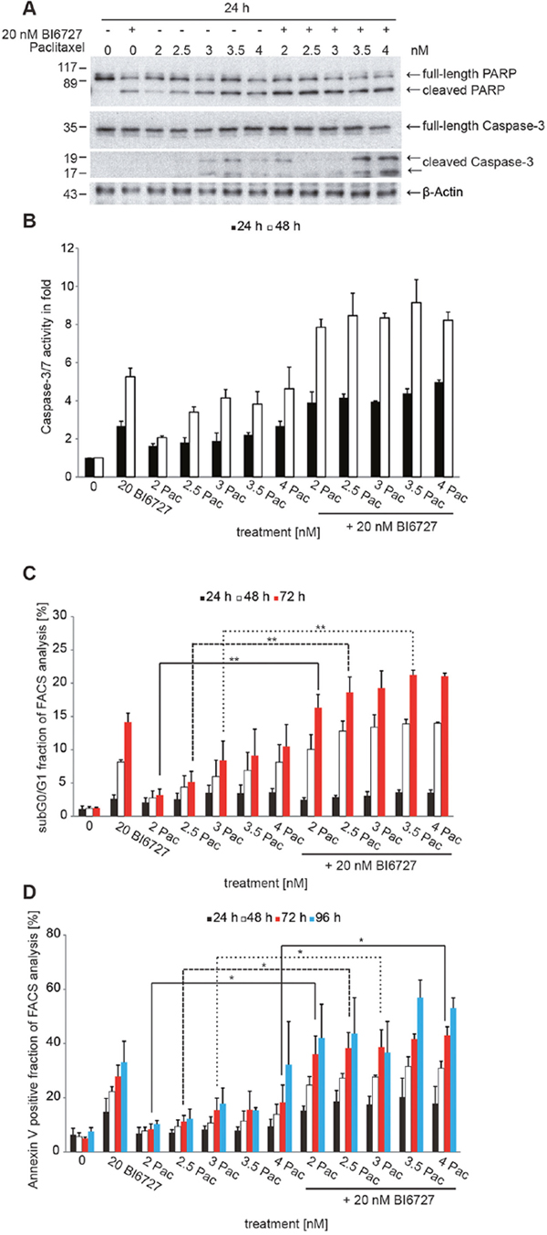 Figure 2: The combinatorial treatment of BI6727 and paclitaxel induces pronounced levels of apoptosis. (A) OVCAR-3 cells were treated with 20 nM BI6727, increasing paclitaxel concentrations or both. Apoptosis was analyzed 24 h post-treatment by western blotting for Caspase-3, full-length and cleaved PARP. β-Actin served as loading control. (B) Caspase-3/7-activity in whole cell lysates of 20 nM BI6727, paclitaxel or both treated OVCAR-3 cells was measured 24 h and 48 h post-treatment using the Caspase-Glo® 3/7 Assay. Each bar graph represents the mean value ± SEM (n=2). Apoptosis was validated (C) by measuring the sub G0/G1 fractions or (D) by PE Annexin V staining. Measurements were statistically significant by two-tailed Student’s t-test (*P ≤ 0.05; **P ≤ 0.01). Each bar graph represents the mean value ± SEM (n=3).