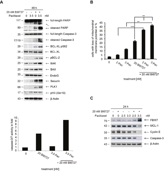 Figure 3: Analysis of apoptotic signaling in ovarian cancer cells. (A) (upper panel) Whole cell lysates of OVCAR-3 cells treated with BI6727 or 3.5 nM paclitaxel or both were analyzed evaluating marker proteins for mitochondrial-mediated apoptosis. Endogenous levels of PARP, cleaved PARP, Caspase-3, cleaved-Caspase-3, BCL-XL pS62, BCL-XL, pBCL-2, BAK, BAX, EndoG, Securin, PLK1, pHistone H3 and ß-Actin were determined by immunoblotting. Caspase-3/7-activity in whole cell lysates of 20 nM BI6727, paclitaxel or both treated OVCAR-3 cells was measured 48 h post-treatment using the Caspase-Glo® 3/7 Assay. (B) Evaluation of the mitochondrial membrane potential. The data are presented as means ± SD. Statistical analysis among treatment groups was performed. ** (P< 0.01), *** (P< 0.001). (C) Endogenous levels of FBW7, MCL-1, Cyclin E, Caspase-3 and ß-Actin were determined by immunoblotting using specific antibodies.