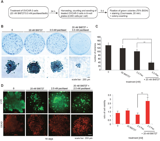 Figure 4: Combinatorial treatment of OVCAR-3 cells with 20 nM BI6727 and 3. 5 nM paclitaxel displays long lasting inhibition of cell growth. (A) Experimental set up of long-term analyzes. (B) Coomassie stained regrown colonies of OVCAR-3 cells treated with 20 nM BI6727, 3.5 nM paclitaxel or both for 24 h. (C) The number of colonies was determined. Numbers were statistically significant by two-tailed Student’s t-test (*P≤ 0.05; **P≤ 0.01). Each bar graph represents the mean value ± SEM (n=3). (D) OVCAR-3 cells were grown as 3-D culture over 14 d and treated with 20 nM BI6727, 2.5 nM paclitaxel or both for 5 d. Cells were stained using the LIVE/DEAD viability/cytotoxicity kit and ratios of viable/dead cells were calculated. Measurements were statistically significant by two-tailed Student’s t-test (*P≤ 0.05; **P≤ 0.01). Each bar graph represents the mean value ± SEM (n=3).