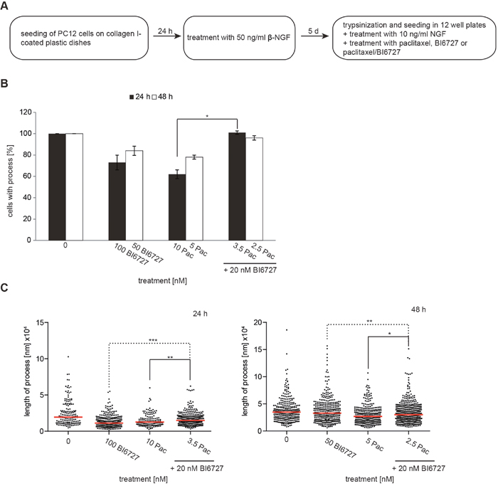 Figure 6: The combinatorial treatment of paclitaxel and BI6727 reduces neurotoxicity. (A) Experimental set up of neurotoxicity analysis using PC-12 cells. (B) PC-12 cells were differentiated into neurons using β-NGF. The outgrowth of neurites was analyzed 24 h and 48 h post-treatment and cells displaying elongations were counted. Numbers were statistically significant by two-tailed Student’s t-test (*P≤ 0.05). Each bar graph represents the mean value ± SEM (n=3). (C) The lengths of neurites were measured 24 h/48 h post-treatment and depicted as Scatter plots. Measurements were statistically significant by Student’s t-test (*P≤ 0.05; **P≤ 0.01; ***P≤ 0.001).