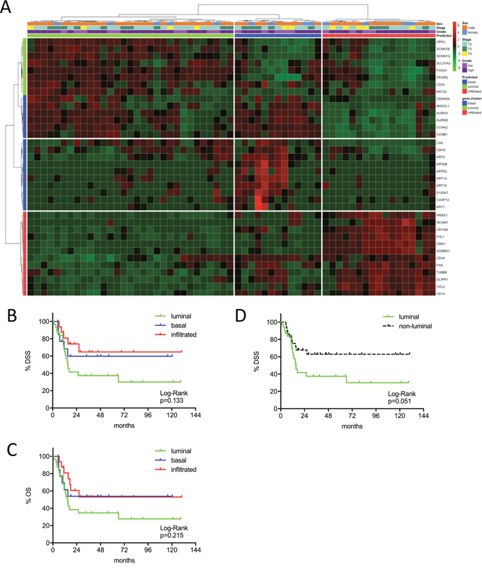 Figure 3: (A) MIBC subtype classification of the MDA cohort (n=58) by gene expression profiling of the reduced consensus geneset based on in silico microarray data (GSE48276). (B, C) Kaplan-Meier plots of overall survival (OS) and disease specific survival (DSS) of the basal, luminal and infiltrated subtype. (D) Kaplan-Meier plots of DSS comparing survival of luminal versus non-luminal MIBC.