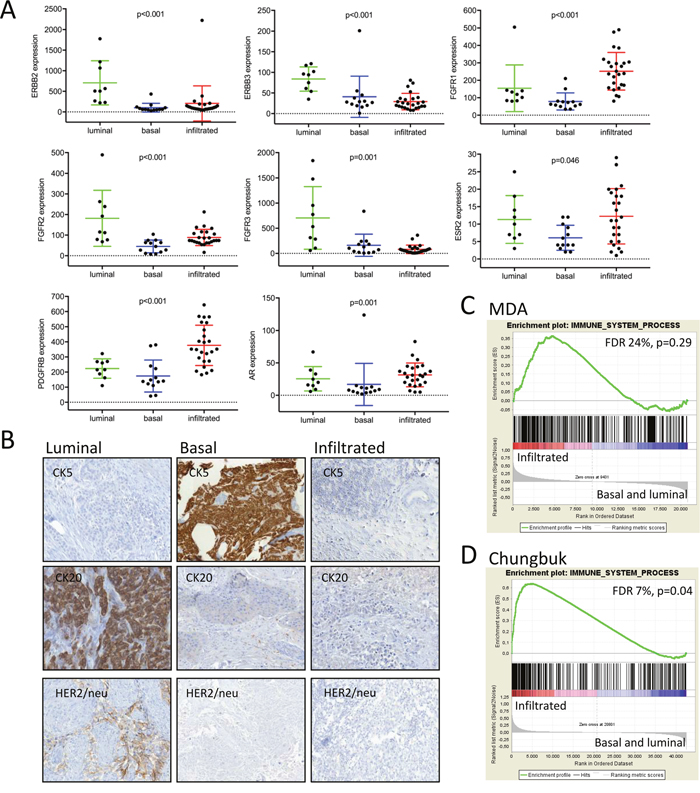 Figure 4: (A) Drug targets were tested for their subtype specific expression by the Kruskal-Wallis test. Absolute quantification of transcript levels was based on normalized nCounter counts. (B) Immunohistochemistry of representative luminal, infiltrated and basal MIBC. (C, D) Gene set enrichment analyses of an immune signature from the Gene Ontology database.