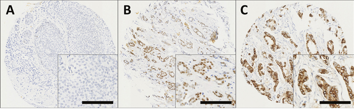 Figure 1: Representative photomicrographs following immunohistochemical staining of (A) negative nuclear and cytoplasmic GPER staining; (B) positive nuclear staining; (C) positive cytoplasmic staining in breast cancer specimens. Photomicrographs are shown at 100x magnification with 200x magnification inset box where the scale bar represents 100μm.