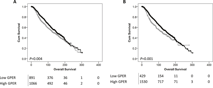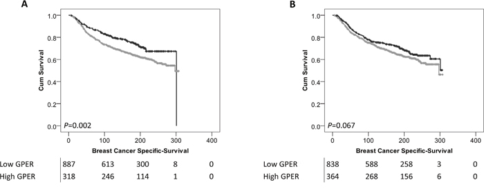 In this study, we describe how GPER protein and mRNA expression levels at the time of surgery are associated with breast cancer patient survival and various clinicopathological variables. Low cytoplasmic GPER protein expression was significantly associated with adverse breast cancer specific survival (P=0.002) and remained so in multivariate analysis including various potentially confounding factors, such as ER status. GPER expression within the nucleus was not associated with patient survival. It would be interesting to hypothesise over the importance of non-genomic actions of GPER; however, this study assessed expression of GPER with no measure of its activity.