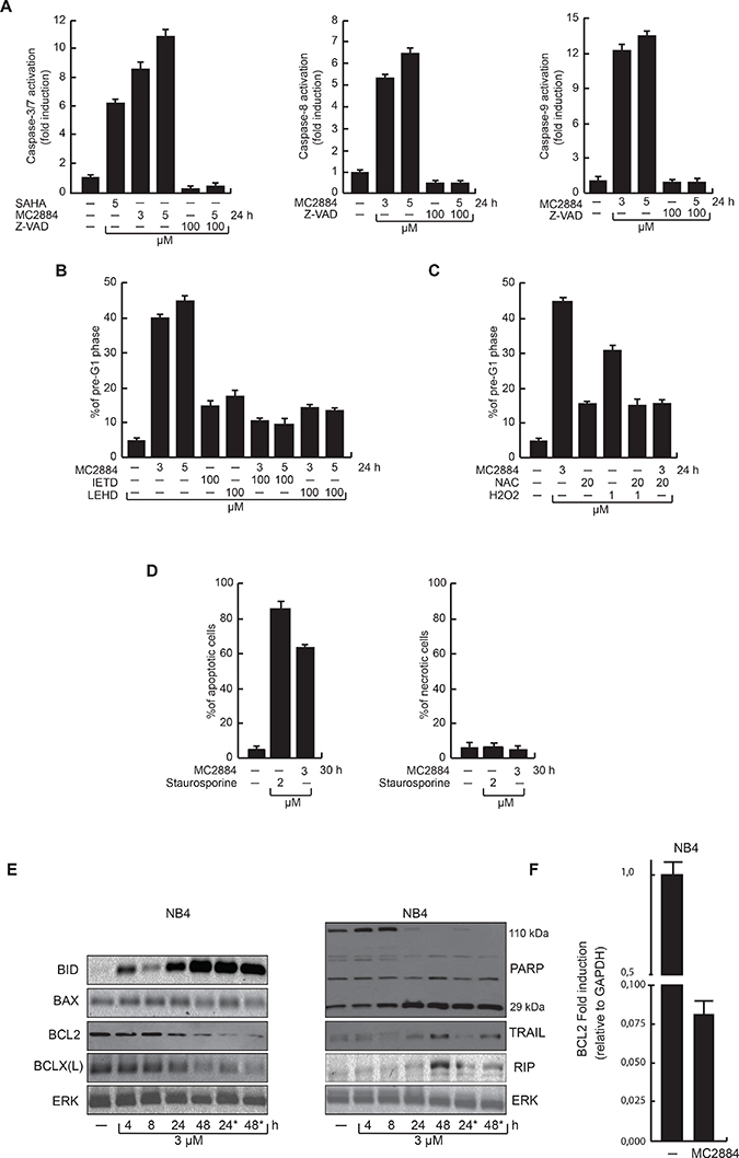 Figure 3: MC2884 induces caspase-dependent apoptosis accompanied by ROS production. (A) FACS analyses of caspase 3/7, 8 and 9 activation upon MC2884 and caspase inhibitors as indicated. SAHA has been used as positive control. (B) FACS analysis of pre-G1 phase in NB4 cells upon treatment with MC2884 in presence of the Caspase 8 and 9 inhibitors, as indicated. (C) FACS analysis of pre-G1 phase in NB4 cells in presence of NAC at the indicated concentration. H2O2 has been used as positive control. (D) FACS analysis of apoptosis (left) and necrosis (Annexin/PI) (right) assays following treatment with MC2884, staurosporine or vehicle for 30 h in NB4 cells. (E) Western blot analyses for cleaved BID, BAX, BCL2, BCLX(L), PARP, TRAIL and RIP expression levels in NB4 treated with MC2884 at the indicated time. *indicates that the MC2884 has been added a second time after 10 h. ERK has been used as reference for loading; (F) RT-PCR analysis of BCL2 RNA expression levels in NB4 treated with MC2884 for 48 hours. MC2884 was used at indicated time and concentrations. Graph showed the mean of three independent experiments with error bars indicating standard deviation.