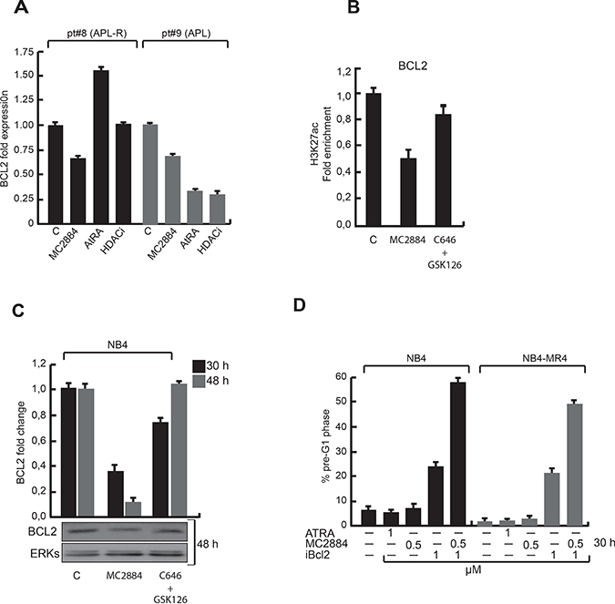 Figure 6: Epigenetic changes upon MC2884 treatment result in reduced BCL2 expression. (A) BCL2 expression by RT-qPCR in acute promyelocityc leukemia sensitive and resistant to standard treatments. (B) ChIP in NB4 cells using H3K27ac antibodies and primers for the BCL2 promoter with the indicated treatments. (C) BCL2 expression by RT-qPCR (top) and western (bottom) after the indicated treatments. (D) FACS analysis of % of AtRA responsive (NB4) and AtRA resistant (NB4-MR4) cells in pre-G1 upon the indicated treatments. MC2884 was used at indicated time and concentrations. Graph showed the mean of three independent experiments with error bars indicating standard deviation.