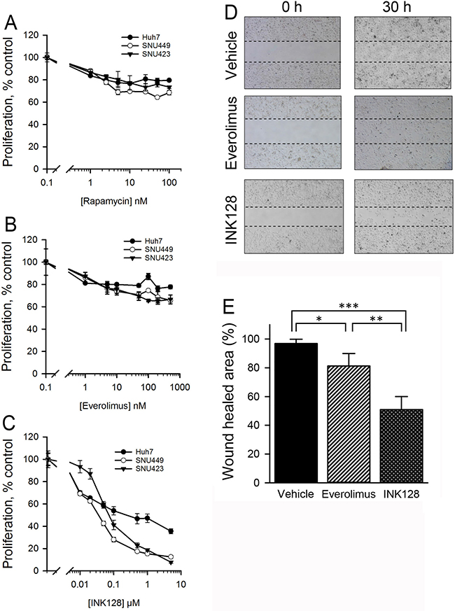 Figure 1: INK128, but not allosteric mTOR inhibitors, show enhanced activity in SNU423 and SNU449 HCC cells. The HCC cell lines SNU423, SNU449 and Huh7 were treated with the allosteric mTOR inhibitors (A) rapamycin, (B) everolimus or (C) the ATP-competitive mTOR inhibitor INK128 for 48 h. Cell proliferation was determined by a WST-1 assay. (D) SNU423 cells were treated with vehicle control or 500 nM everolimus or INK128. Dashed lines represent the starting point of the in vitro migration assay at time 0. At 30 h after cell migration, the gap open areas were photographed and measured (E). *p < 0.05, **p < 0.01, ***p < 0.001. Single replicates from at least duplicate experiments.