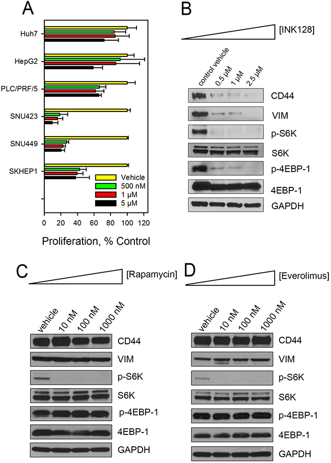 Figure 2: INK128 selectively kills CD44high HCC cells. (A) CD44low cells (Huh7, PLC/PRF/5 and HepG2) and CD44high (SNU423, SNU449, SK-Hep-1) HCC cells were treated with increasing concentrations of INK128 for 72 h. Cell proliferation was determined using a WST-1 assay. CD44high SNU423 cells were treated with increasing concentrations of (B) INK128, (C) rapamycin or (D) everolimus for 48 h. CD44, vimentin and downstream effectors of mTOR pathway were evaluated by immunoblotting. Single replicates from at least duplicate experiments.