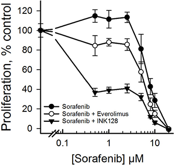 Figure 4: Improved antiproliferative effects of INK128 alone or in combination with sorafenib. The CD44high cells SNU423 cells were treated with sorafenib alone or in combination with everolimus or INK128 for 72 h. Cell proliferation was determined using a WST-1 assay. Single replicate from at least duplicate experiments.