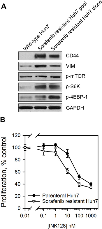 Figure 5: Sorafenib resistant cells display enhanced mTOR pathway activation and improved sensitivity to INK128. (A) CD44, vimentin and downstream effectors of the mTOR pathway were measured in wild-type Huh7 or Huh7 cells with acquired sorafenib resistance. (B) Sorafenib resistant Huh7 or parenteral cells were treated with INK128 for 72 h. Cell proliferation was measured by a WST-1 assay. Single replicates from at least duplicate experiments.