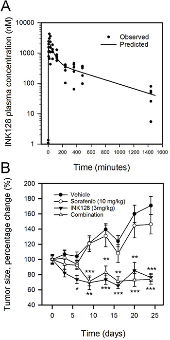 Figure 6: INK128 inhibits growth of SK-Hep1 xenografts in mice. (A) Plasma pharmacokinetics of a single, oral dose of INK128 (3 mg/kg). Observed concentrations at specified time post dose are represented as dots. Line is a fit of the naïve pooled data. (B) Tumor volume measurements of SK-Hep1 subcutaneous xenografts in mice receiving vehicle, sorafenib, INK128 or combination treatments. Sorafenib was dosed daily at 10 mg/kg. INK128 was dosed every other day at 3 mg/kg. Data are presented as change from baseline tumor volume. *P < 0.05, **P < 0.01, ***P < 0.001, compared to vehicle control.