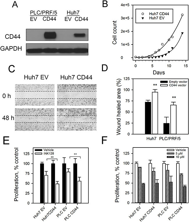 Figure 3: CD44 overexpressing cells have a more aggressive phenotype and improved response to INK128. (A) PLC/PRF/5 and Huh7 cells were stably transfected with CD44 expressing vector or empty vector (EV) control. CD44 and GAPDH levels were measured by immunoblotting. (B) Cell growth curves of Huh7CD44 and Huh7EV cells. (C) In vitro migration of Huh7CD44 and Huh7EV cells. (D) In vitro migration of Huh7CD44 and Huh7EV and PLC/PRF/5CD44 and PLC/PRF/5EV cells. (E) Huh7CD44, Huh7EV, PLC/PRF/5CD44 and PLC/PRF/5EV cells were treated with 500 nM INK128 or vehicle control for 72 h. Cell proliferation was measured by a WST-1 assay. (F) Huh7 and PLC/PRF/5 expressing CD44 or EV control cells were treated with sorafenib for 72 h and cell viability was determined using WST-1 reagent. **p < 0.01, Student’s t-test.