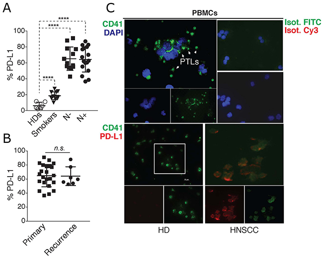 A long-standing question in cancer immunotherapy is how to identify the most suitable patients that would benefit from immune checkpoint inhibitors. Despite the successes of checkpoint inhibitors in several cancers, including HNSCC [20, 21], there are still a substantial proportion of patients that do not respond to therapy. Hence, considerable research efforts are now directed to identify routinely available blood and clinical markers that may predict response to therapy. Our study provides the first report of PD-L1 expression in circulating blood platelets and introduces them as potentially novel and non-invasive biomarkers in head and neck squamous cell carcinoma (HNSCC), with yet unexplored implications for checkpoint inhibition therapies. These observations were also extended to other cancer types, as we also found increased PD-L1 expression on platelets from patients with lung cancer. In our patient cohort, PD-L1 expression was not correlated with disease stage, the occurence of lymph node metastasis, or with the incidence of the tumor (primary vs recurrent). Indeed, platelet-PD-L1 (pPD-L1) levels were comparably high in all cancer cases compared to healthy donors. Interestingly, we found that cancer-free individuals with smoking habits displayed an intermediate phenotype, with significantly higher PD-L1 expression in both PBMCs and purified platelets, compared to healthy donors.