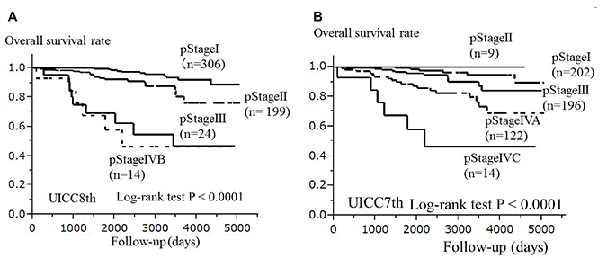 The clinicopathological factors were shown in Table 1. The association between the pStage in the UICC7th and the pStage in the UICC8th is shown in Table 2. Of the 306 patients with pStage I in the UICC8th, 202, 6, 74, and 24 patients were restaged from pStage I, II, III, and IVA in the UICC7th, respectively. Of the 199 patients with pStage II in the UICC8th, 3, 122, and 74 patient were restaged from pStage II, III, and IVA in the UICC7th, respectively. Twenty-four patients with pStage III and 14 patients with pStage IVB in the UICC8th were restaged from 24 patients with pStage IVA and 14 patients with pStage IVC in the UICC7th, respectively.