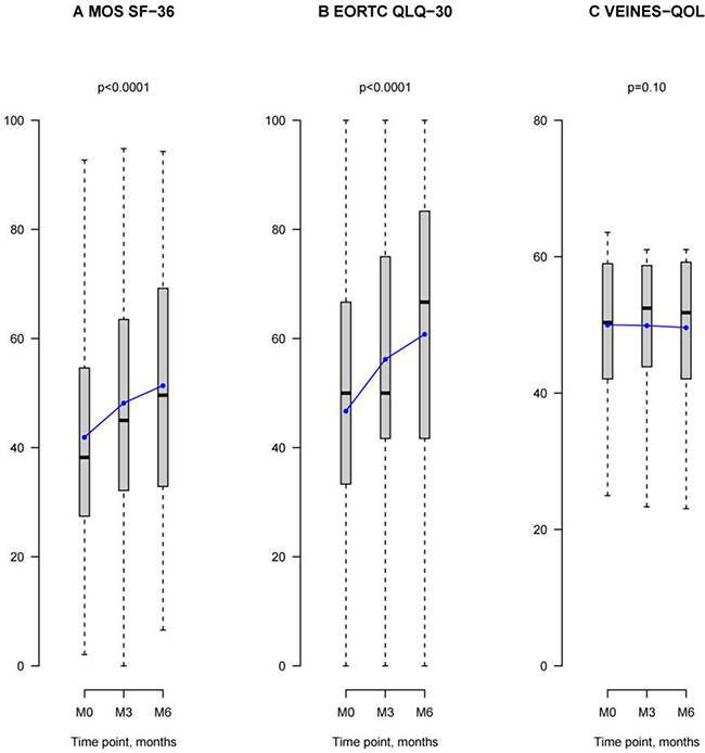 Figure 3: QoL assessments at 0, 3, and 6-month follow-ups in patients treated with LMWH. Grey box-and-whisker plots show the median, interquartile, and overall spread of all the QoL data at M0, M3, and M6. Blue linear plots illustrate the mean of the distribution of QoL scores at each observation period M0, M3, and M6. (A) Graph illustrates health-related quality of life (HRQoL) scores in the MOS SF-36 survey. At M0, HRQoL mean score was 42 with a median score of 38 [27; 55]. At M3, the mean score was 48 with a median of 45 [32; 63]. At M6, the mean score was 51 with a median of 50 [33; 69]. HRQoL scores increased significantly over the 6-month observation period (P < 0.0001). (B) Graph shows global health status/QoL scores in the EORTC QLQ-C30 questionnaire which assessed cancer-related QoL. At M0, the mean QoL score was 47, with a median of 50 [33; 67]. At M3, the mean QoL score was 56, with a median of 50 [42; 75]. At M6, the mean score was 61, with a median of 67 [44; 83]. Global health status/QoL scores significantly changed over the 6-month observation period (P < 0.0001). (C) Graph shows VEINES-QOL scores. At M0, the mean VEINES-QOL score was 50, with median of 50 [42; 59]. At M3, the mean VEINES-QOL score was 50, with a median of 52 [44; 59]. At M6, the mean of VEINES-QOL scores was 50, with a median of 52 [42; 59]. VEINES-QOL scores did not change during the 6-month LMWH treatment period.