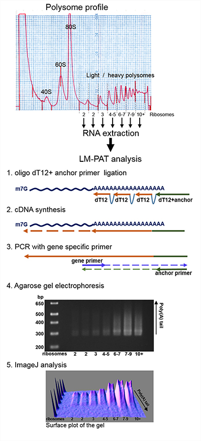 Figure 1: Schematic description of the experimental procedure. Polysomes from human HCT116 cell extracts were separated by ultracentrifugation on a 15–50% sucrose gradient. RNA from polysomal fractions were isolated and subjected to Ligase-Mediated Poly(A) Test (LM-PAT). After amplification with gene specific forward primers of the resulting cDNA, the distribution of poly(A) tail lengths was visualized by agarose gel electrophoresis. The size of the DNA ladder fragments is indicated in base pairs on the left, the number of ribosomes in each fraction is indicated below the gel. 3D surface plot analysis of the agarose gel image was obtained using ImageJ software with minimum set to 0%, maximum to 100% and z-scale to 1.0.