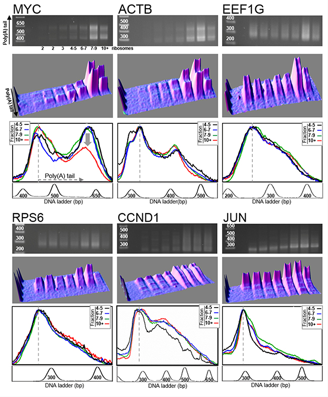 Figure 2: Distribution of poly(A) tail lengths of MYC, ACTB, EEF1G, RPS6, CCND1 and JUN mRNAs. RNAs extracted from each fraction of a polysome fractionation experiment of HCT116 cell extract were subjected to LM-PAT analysis and cDNAs were amplified with gene specific forward primers. For the six genes presented, cDNAs were amplified from the same polysome fractionation experiment and LM-PAT reaction; only gene specific forward primers differ according to the analyzed gene. For each gene, MYC, ACTB, EEF1G, RPS6, CCND1 and JUN, the agarose gel with DNA ladder on the left (top panel), the 3D surface plot analysis of the agarose gel (middle panel) and the stacked image of the density profiles of the last four lanes corresponding to heavy polysomes (bottom panel) are shown. In the density profile panel, the fraction containing 4–5 ribosomes is in black, the fraction 6–7 ribosomes in blue, the fraction 7–9 ribosomes in green and the fraction with more than 10 ribosomes (10+) in red. For MYC gene, the vertical grey arrow on the density profile panel highlights the differences in poly(A) tail distribution between the four fractions. The density profiles of the gel lanes were performed without O. D. calibration. This allowed to normalize the profiles on the most intense band corresponding to mRNAs with minimal poly(A) tail (indicated by a dotted line). For each gene, a profile of the DNA ladder is presented below the density profile panel. Note that the experiment presented in this figure correspond to the control experiment of Figure 3 (cells electroporated with sh-Ctrl), see also Exp. 1 of Figure 4.