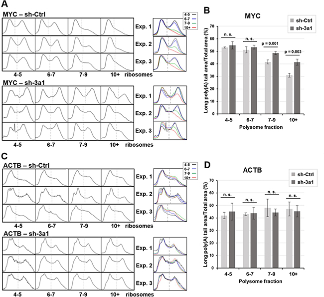 Figure 4: Density profiles of MYC and ACTB poly(A) tails and poly(A) peak area measurements for three independent experiments in eRF3a-depleted and control cells. The montage and superimposition of the density profiles of the last four fractions (4–5, 6–7, 7–9 and 10+ ribosomes) of 3 polysome fractionation experiments with either eRF3a-depleted (sh-3a1) or control (sh-Ctrl) cell extracts are shown for MYC mRNA (A) and ACTB mRNA (C). Agarose gel and 3D surface plot images of experiment 1 (Exp.1) are shown in Figure 2 and 3 for control and eRF3a-depleted cells, respectively. Agarose gel and 3D surface plot images of experiments 2 (Exp. 2) and 3 (Exp. 3) are shown in Supplementary Figure 6. For MYC – sh-3a, exp. 3, the narrow peak in the middle of fraction 4-5 profile is due to a dust dot in the agarose gel (see the corresponding agarose gel in Supplementary Figure 6). On each density profile, the dash line indicates the boundary of the long poly(A) peak area used for the peak area measurements. For each experiment, the dash line position was determined on the fraction presenting a clear separation of the two peaks (usually fraction 4–5) and set at the same position for the other fractions. The poly(A) peak areas of the density profiles were measured using ImageJ software and the ratio of long poly(A) tail area on total profile area was calculated for the four fractions (4–5, 6–7, 7–9 and 10+ ribosomes) of the 3 polysome fractionation experiments with either control (sh-Ctrl) cells or eRF3a-depleted cells (sh-3a1). For MYC mRNA (B) and ACTB mRNA (D), bars represent the mean values of the three experiments. Error bars indicate the standard deviation. Statistical significance of differences between sh-Ctrl and sh-3a1 were calculated with paired Student’s t-test. For statistically significant differences, p-values are indicated above the bars; p-values ≥ 0.05 were considered as not statistically significant (n. s.).