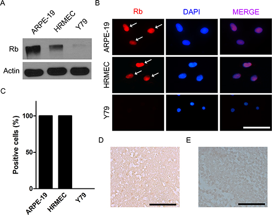 Figure 1: Retinoblastoma is characterized by the loss of functional alleles of RB1 gene. (A) Expression of retinoblastoma protein in ARPE-19 cells, HRMECs, and Y79 cells. (B) ARPE-19 cells, HRMECs, and Y79 cells were stained with the antibody to retinoblastoma protein. White arrows indicate positively stained nuclei. (C) Quantitative analysis of immunocytochemical staining. (D) A representative example of the expression of retinoblastoma protein analyzed by immunohistochemical staining in in vivo orthotopic tumors at 4 weeks after intravitreal injection of Y79 cells. (E) A representative example of the expression of retinoblastoma protein in human retinoblastoma tissues from a 21-month-old male patient. All scale bars represent 50 μm. Rb, retinoblastoma protein.