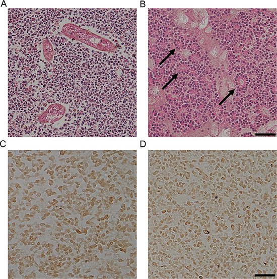 We developed in vivo orthotopic tumor model with Y79 cells as previously described [33]. Briefly, Y79 cells were prepared in serum-free RPMI-1640 at the concentration of 1 × 105 cells/μL. After adequate anesthesia, we injected cell suspension (1 μL) into the vitreous cavity of the right eyes of mice. For immunohistochemistry, mice (n = 6) were sacrificed with CO2 inhalation and enucleated eye were prepared for paraffin blocks at 4 weeks after the injection of tumor cells.